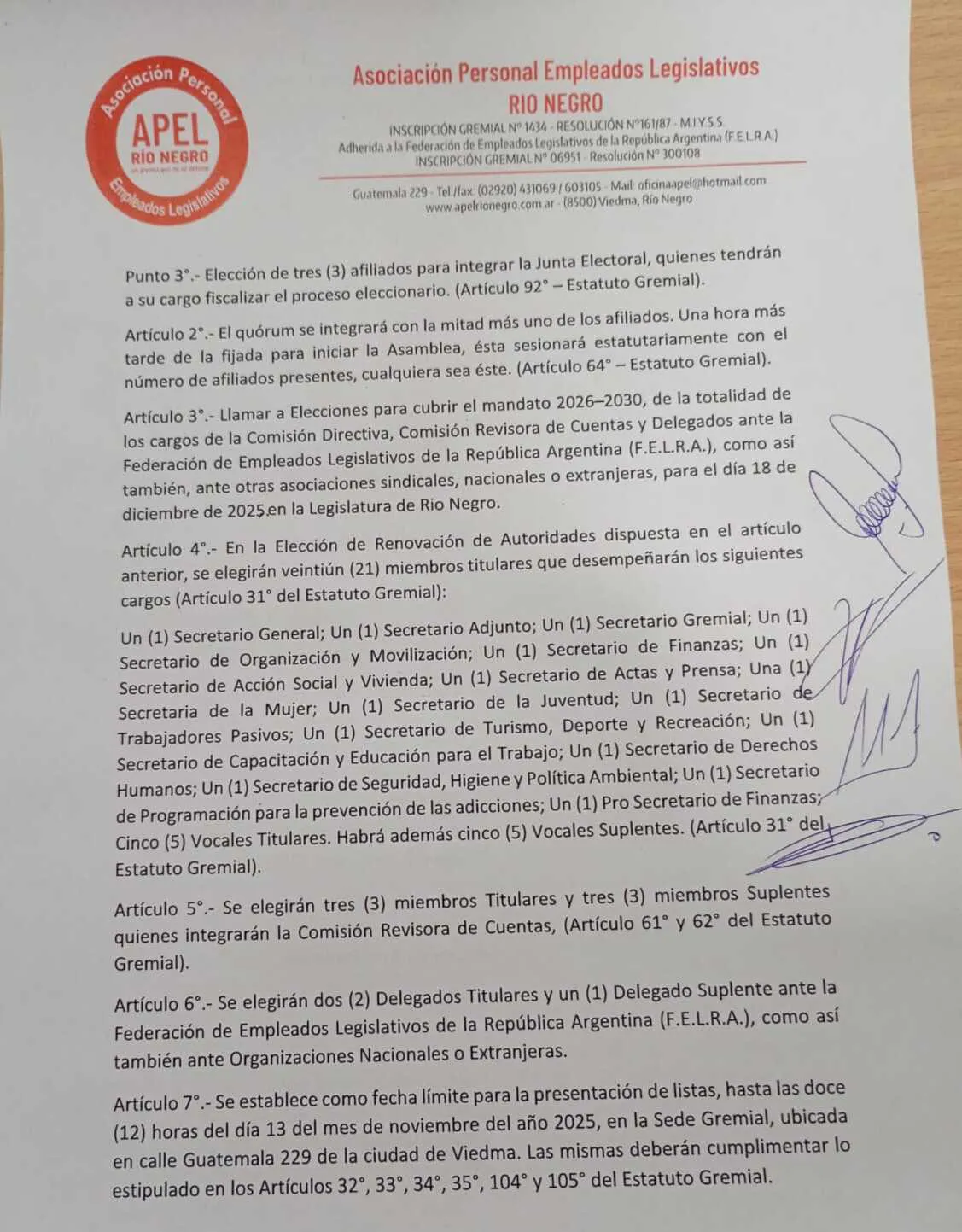 Artículo 1°.- Llamar a Asamblea General Extraordinaria para el día 29 de octubre de 2.025, en la sede gremial, ubicada en calle Guatemala 229 de la ciudad de Viedma, a las 14,00 horas, (Artículo 70° – inc. a) del Estatuto Gremial), para tratar el siguiente: